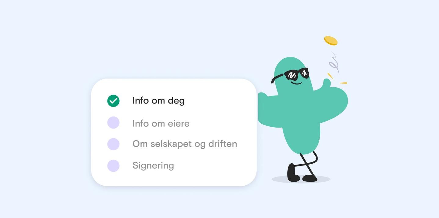 Fortell oss hva bedriften din skal hete, og hva AS-et skal drive med. I tillegg fyller du inn dine egne personopplysninger, og hvem du eventuelt skal eie og drifte selskapet sammen med.